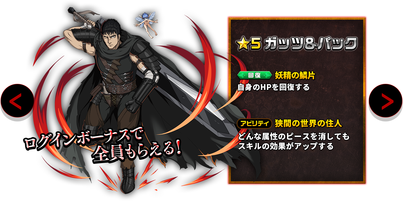 さらに!ログインするだけで限定キャラ「★5ガッツ&パック」と「★4仕込み義手」が必ず手に入る!