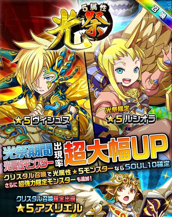 日替わりでそれぞれ、各属性のモンスターの出現率が超UPします。欲しい属性のモンスターがいたらこの機会にGETしましょう