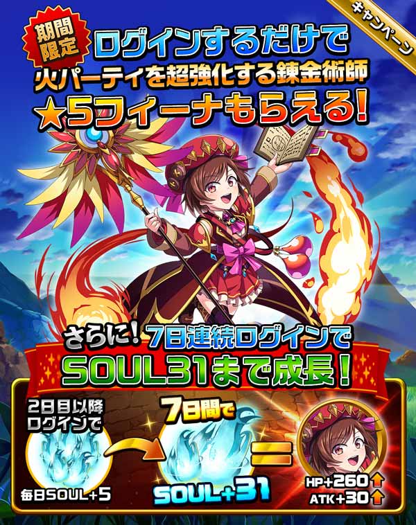 期間中ログインするだけで、火属性パーティを強化する「★5フィーナ」が獲得できます