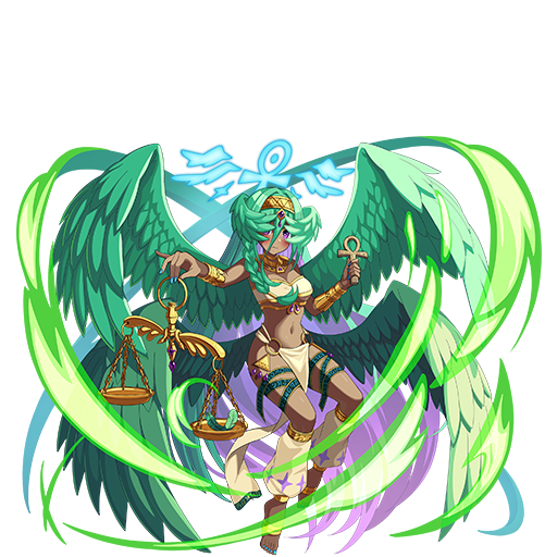 敵出現時とダメージを受けた時、「羽の秤」を発動する、毎ターン、木属性の味方が敵にスキルで攻撃した際、1度だけスキル1で追撃する