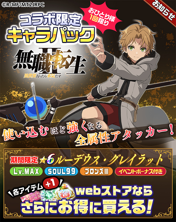 ・★6 ルーデウス・グレイラットx1 ┗SOUL99&Lv.MAX&モンスターグレードブロンズⅢの育成済の状態で手に入ります ・マスターベリーx2 ・回復薬交換券x3 ・人輝幻晶x2 ※アプリ内よりキャラクター以外の各アイテムの個数が1個増量しています |