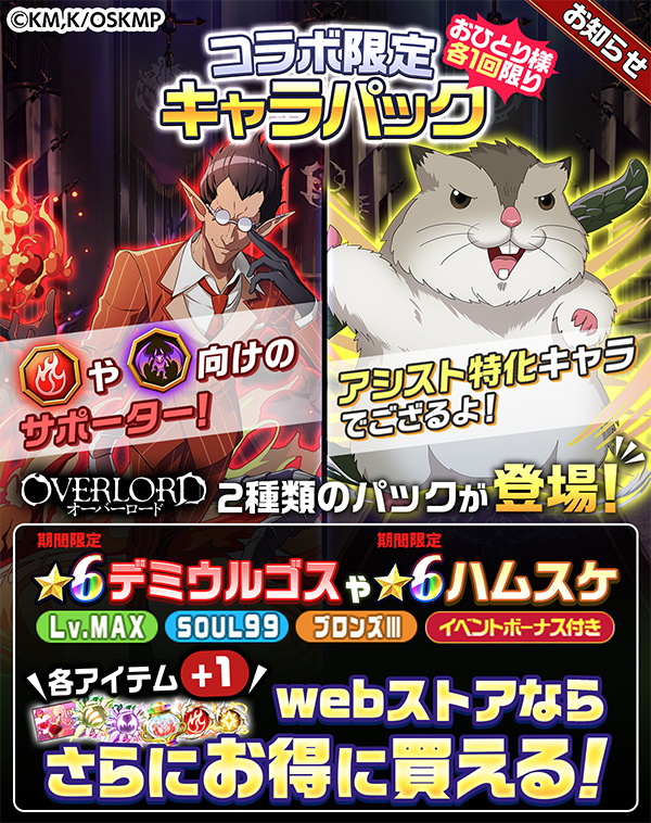 ■コラボ限定キャラパック① ・★6 デミウルゴス ┗SOUL99&Lv.MAX&モンスターグレードブロンズⅢの育成済の状態で手に入ります ・マスターベリーx2 ・回復薬交換券x3 ・魔輝幻晶x2 ・獄炎のスフィアx2 ※アプリ内よりキャラクター以外の各アイテムの個数が1個増量しています |