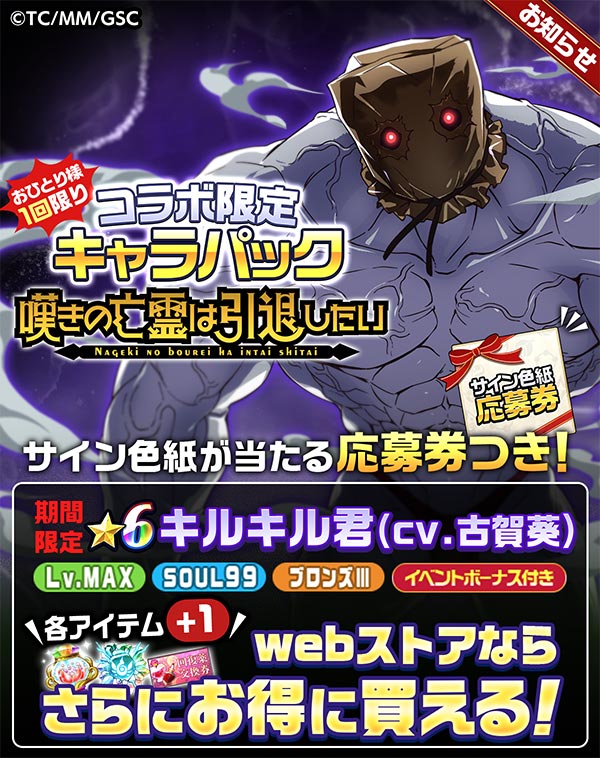 ・★6 キルキル君 ┗SOUL99&Lv.MAX&モンスターグレードブロンズⅢの育成済の状態で手に入ります ・マスターベリーx2 ・回復薬交換券x3 ・霊輝幻晶x2 ・サイン色紙応募券(キャラパック)x1 ※アプリ内よりサイン色紙応募券以外の各アイテムの個数が1個増量しています |