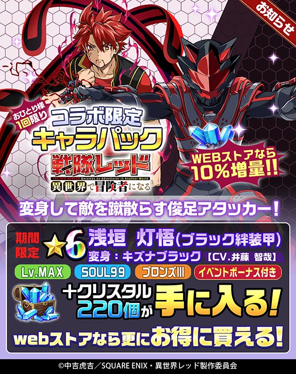 ・★6 浅垣 灯悟(ブラック絆装甲)x1 ┗SOUL99&Lv.MAX&モンスターグレードブロンズⅢの育成済の状態で手に入ります ・クリスタル220個 ┗有償クリスタル125個+無償クリスタル95個 ※アプリ内より無償クリスタルが20個増量しています |