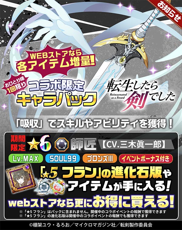 ■コラボ限定キャラパック ・★6 師匠 ┗SOUL99&Lv.MAX&モンスターグレードブロンズⅢの育成済の状態で手に入ります ・マスターベリーx4 ・虚空のスフィアx4 ・フランの進化石版x1 ※アプリ内より各アイテムの個数が増量しています |