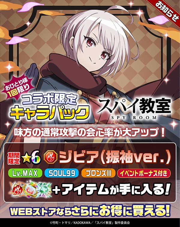 ■コラボ限定キャラパック ジビア(振袖ver.) ・★6 ジビア(振袖ver.) ┗SOUL99&Lv.MAX&モンスターグレードブロンズⅢの育成済の状態で手に入ります ・マスターベリーx4 ・獄炎のスフィアx4 ・人輝幻晶x4 ※アプリ内より各アイテムの個数が増量しています |