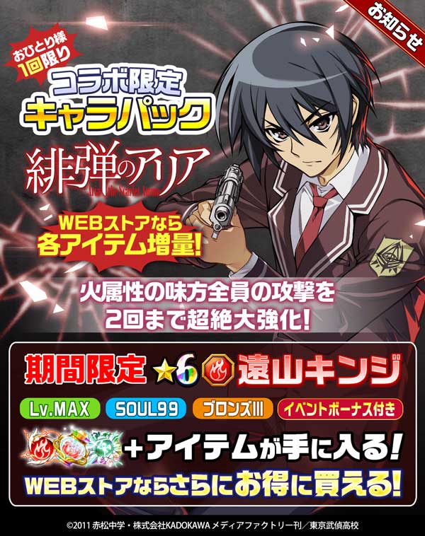 ■コラボ限定キャラパック 遠山 キンジ ・★6 遠山 キンジ ┗SOUL99&Lv.MAX&モンスターグレードブロンズⅢの育成済の状態で手に入ります ・マスターベリーx4 ・獄炎のスフィアx4 ・人輝幻晶x4 ※アプリ内より各アイテムの個数が増量しています |