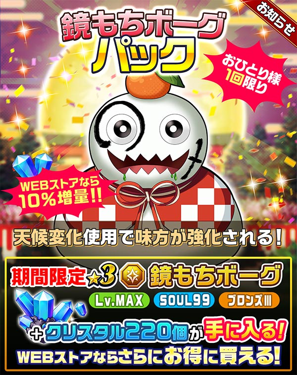 本パック限定のモンスター「★3 鏡もちボーグ」とクリスタルが獲得できる期間限定のパックとなります